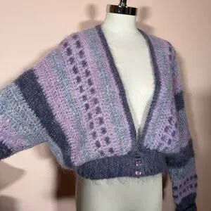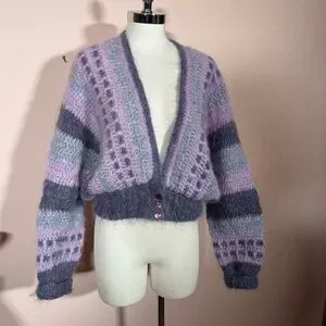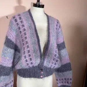 Vintage Mohair wool grandmacore Lavender Grey Crochet Ireland Cardigan Sweater