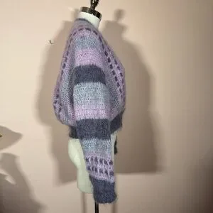 Beautiful fuzzy mohair stripes of lavender, pale blues and medium grey on this dreamy cardigan sweater. Loose crochet knit of Warm and cozy blend of mohair and wool. Flattering design with a deep V neckline, batwing and a cinched waist with buttons that sits at your natural waist. Dreamy sweater made in Dublin Ireland.