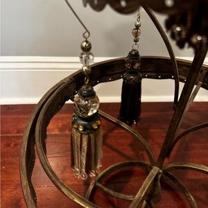 Elegant spiral metal plant stand with intricate design. Features a bronze finish with decorative tassels.