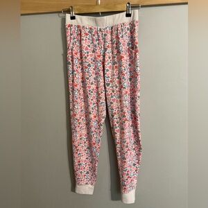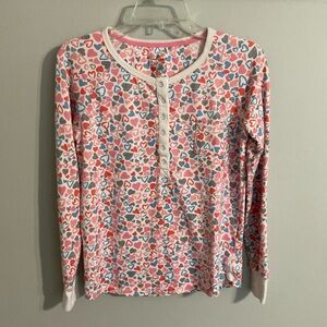Sweet sleepwear set with heart print. Perfect for Valentine’s Day. Henley style top with partial button front. Coordinating full-length pants. Ribbed cuffs and neckline trim. Soft fabric for nighttime comfort. Pants have pockets and top has ribbed side for even more stretch. X-Small/26” waist unstretched.