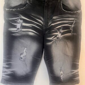 Distressed Denim Shorts in Faded Dark Gray and White with Ripped Details