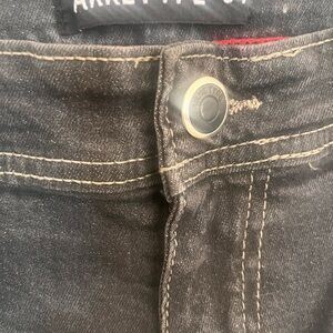 Stylish denim shorts featuring a trendy faded black wash with strategic distressing and rips. These casual shorts offer a modern, edgy look with their intentionally worn appearance and classic five-pocket design. Perfect for casual summer outfits.