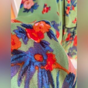 Five buttons down the front, flowy style, whimsy, hummingbird print all over with botanical flowers - Very Vibrant!
