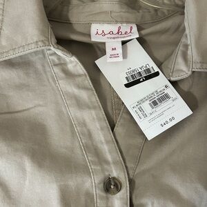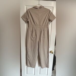 Chic khaki jumpsuit with button-front design. Short sleeves and tailored fit. Ideal for casual elegance.