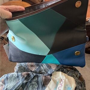 NWT Soruka leather bag in ocean turquoise, teal and navy blue. Full of style and personality with a geometric and color block design.
