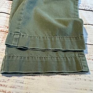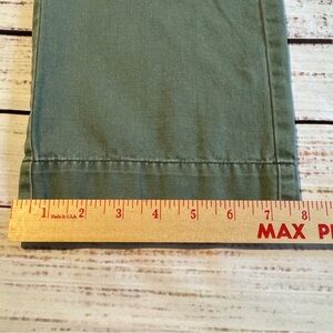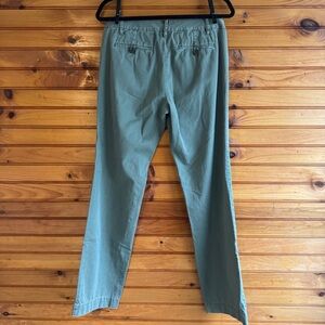 Timeless Anthropologie Paper Boy trousers in a soft sage green cotton twill. Classic straight-leg silhouette with button-tab and zip closure and back button pockets (pockets were removed and sewn shut for a smoother fit through the hips). The fabric has a gently broken-in, lived-in look that works beautifully with the relaxed, elevated feel of these pants. Easy to style year-round as a capsule wardrobe staple.