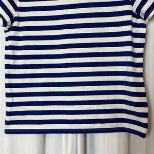 Classic Talbots striped shirt featuring a navy-blue and white Breton stripe and an embellished white beaded neckline. Made from a soft stretch cotton blend, this short sleeve top offers a comfortable, flattering fit.
