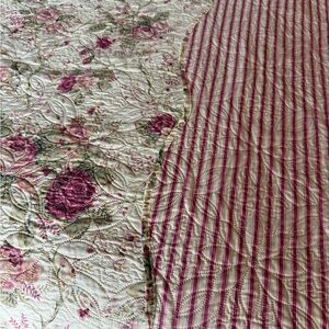 This Chic Quilt Coverlet features a shabby pink scalloped edge with a stripe ticking back, giving it a vintage country style. Made from cotton, this king size quilt coverlet in cream, pink, and green colors adds a touch of elegance to any bedroom. The quilted design and quality brand ensure both style and comfort for a cozy bedroom decor. This coverlet is 88 in by 100 in.
