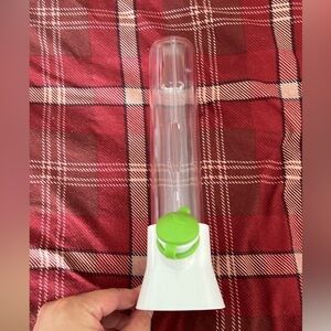 The Herb Savor Eco is designed to prolong the life of fresh herbs by keeping them hydrated. It features a clear plastic container with a water reservoir at the base to maintain freshness.