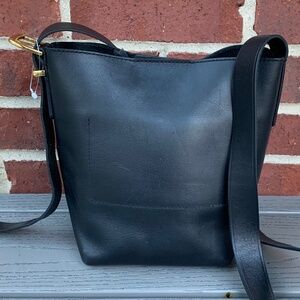 Hard to find Madewell Mini Bucket Tote! Features a magnetic closure, interior pocket, flat base, adjustable crossbody strap and made from 100% soft leather. Approx measurements: 8 1/2" H x 8 3/4" W x 4 1/2" D with a 14-22" convertible strap drop. New condition, no tags, and minor marks/creases throughout from store handling as pictured. Black with gold tone hardware. Firm price!