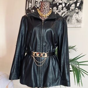 Mobwife black leather jacket made of genuine lamb skin women’s size XL. Missing belt and signs of wear around the bottom and down middle zipper in all in fairly good condition from early 2000s Worthington leather measurements laying flat are 21 inches across, 28inches length, 22 inch sleeves. Lamb leather sopranos office corporategoth powerdressing