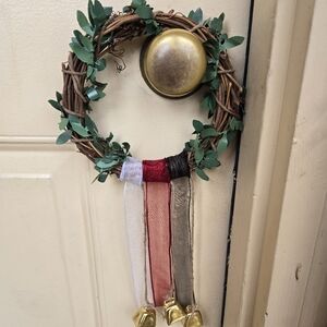Enhance your holiday decor with this charming wreath featuring gold bells and colorful ribbons. Perfect for adding a festive touch to any door. Handmade by me, with reiki charged energy. Great for outdoor or indoor use. Size is 6 inches in diameter