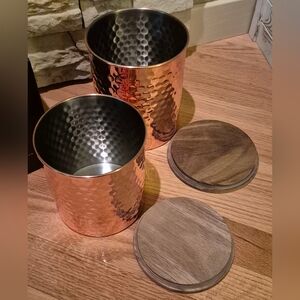 Large hammered copper canister set by Uncommon James. Elegant and stylish with a wooden lid. Large canister is 70 oz and smaller one is 50 oz. Never been used. Taken out of box for pictures.