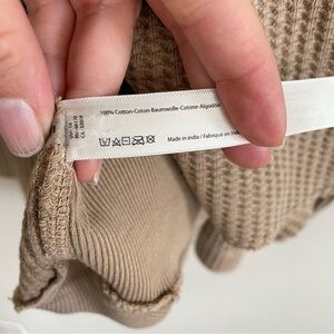 Features: Soft cotton fabrication, thermal design, wide scoop-neckline, drop-shoulder sleeves, high-low hem.