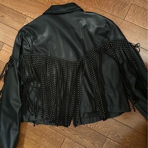 Black faux leather jacket. fringe with studs on the front and back. Snap buttons. Slightly cropped. New with tags, excellent condition, tiny mark on the back but not very noticible.