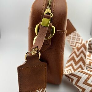 Madewell Leather Transport Camera Crossbody Bag Purse Brown Goldtone Hardware color is described as English Saddle