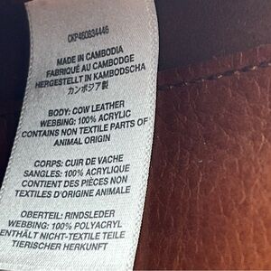 This bag has a detachable NEW strap in cream and brown the strap is not leather. 2" W adjustable 28-52"