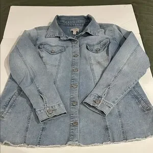 Logo brand denim jacket. Longer length with frayed hem. Size 18W light bleached wash. Never worn.