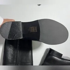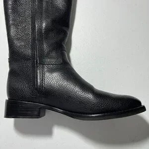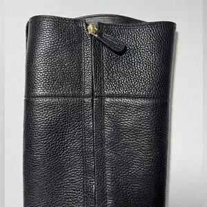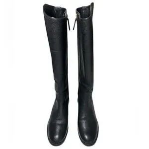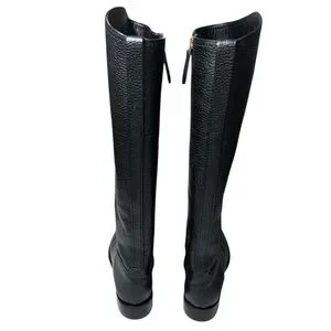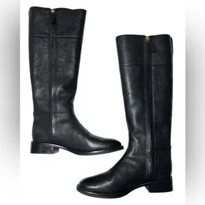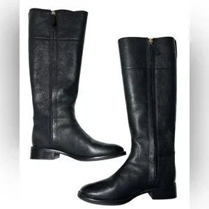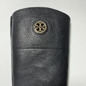 These are stylish knee-high riding boots from Tory Burch, crafted in black tumbled leather. They feature a classic design with a logo emblem and are perfect for both casual and formal occasions. Wore once.