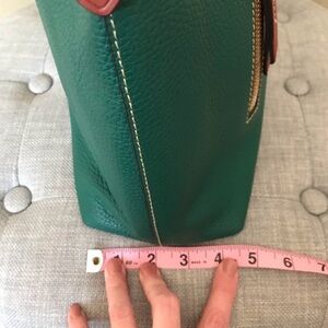Elevate your style with the Dooney & Bourke Teal Leather Shoulder Bag. This elegant bag features a vibrant Leaf color, perfect for adding a pop of color to any outfit. Crafted with high-quality leather, it offers both durability and sophistication. Ideal for everyday use or special occasions.