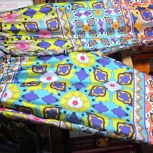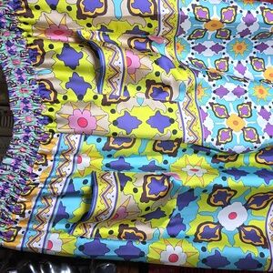 How fun are these? Lightweight, colorful and comfortable! Elasticized waistband has drawstring with beaded accents. Pockets at hip and two pockets at the rear. Very cool and they pack up super small so they are great for vacation! Fabric content tag is missing, but they are 100% polyester and machine washable. New without tags.