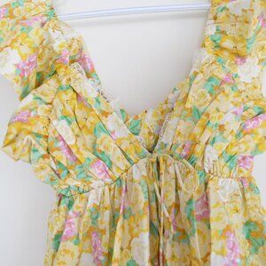 For Love & Lemons Yellow Tamra Dress with Florals & Ruffle Mini Dress M