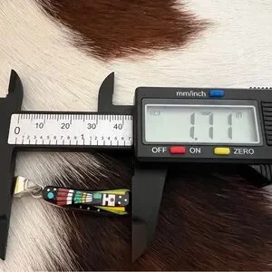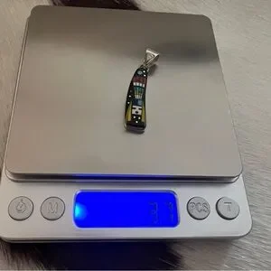 For your consideration is this striking handcrafted Zuni micro-inlay Kachina pendant made of sterling silver. The exquisite micro-inlay work involves the precise cutting and setting of very small pieces of various stones and shells to create a detailed, one-of-a-kind design. The pendant features a vibrant Kachina figure with geometric patterns in multiple colors, set against a black background. The piece is hallmarked "RD" and signed "sterling", indicating its Native American origin and material composition.