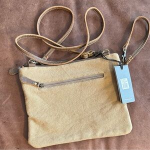 NWT crossbody by Myra Bag. Features pink and cream woven design. Accented with brown leather trim. Outside clip for babbles or keys. Exterior and interior zip pockets. iPhone fits easily in the exterior pocket! Approx size 10-1/2” x 8-1/2”