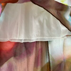 Elegant strapless dress with a vibrant multicolor pattern. Flowy and stylish design. Perfect for any occasion.