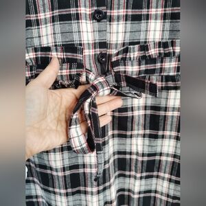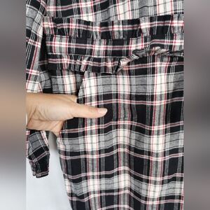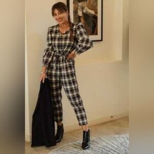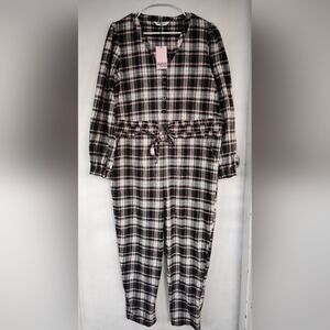 The jumpsuit is a Smash + Tess plaid romper, specifically identified as the Remy Henley Romper in Black Plaid. Jumpsuit In Black And White size Large Black white and red. NWT This romper features a black and white plaid (check) pattern, a V-neck henley placket neckline, 3/4 length sleeves, and in-seam pockets. It is made from 98% cotton 2% elastine. Ptp 21" inseam 24.5" aprox Length from the shoulder to the end 54.5" aprox