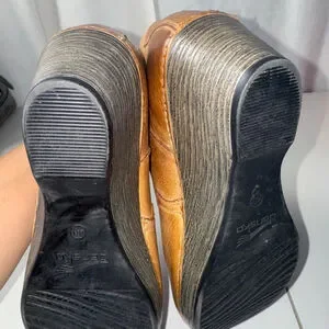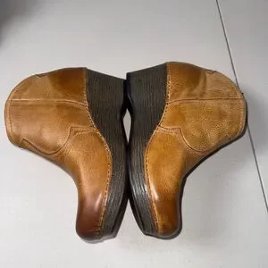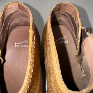 These are a pair of women's Dansko brown leather wedge ankle boots, size 9.5, featuring a textured finish and a darker brown toe and heel area. They have side zippers with black leather silver tassels. The boots have a dark brown wedge heel with a ribbed texture and black rubber outsoles with a wavy tread distressed look pattern. The insoles are brown with the "Dansko" logo visible. There are some visible wear but not a lot..