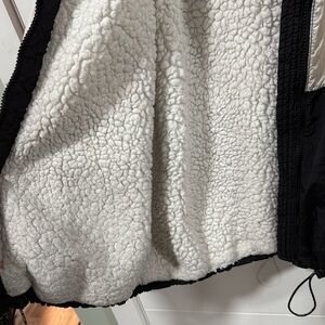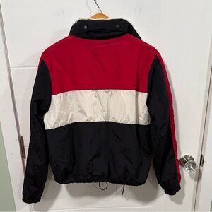 Bold jacket with red and black panels. Features cozy white sherpa lining.