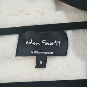 Stylish and cozy Eden Society quilted jacket in a deep red color with plush sherpa lining. Features a full zip and snap closure, front flap pockets, and an adjustable interior drawstring waist for a flattering fit. Lightweight yet warm — perfect for chilly fall and winter days.