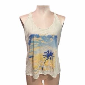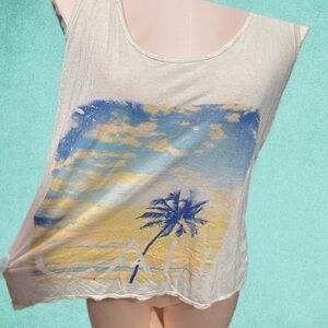 Preloved Women's White and Blue Cali / Palm Tree Tank Top w Cord / Rope straps