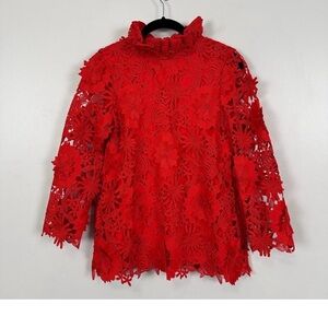 ✨ Elegant, bold, and statement-making! This Tuckernuck Red Guipure Lace Faye Blouse is a showstopper in vibrant crimson red. Crafted from intricate guipure lace with a romantic bow tie back, this best-selling blouse features a swing silhouette, dramatic 2” ruffle stand collar, and ¾ length sleeves for elevated style.