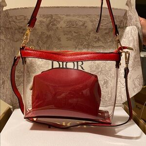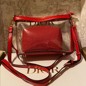 Elegant Dior crossbody with red accents. Transparent design for a modern look. Perfect for versatile styling.