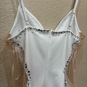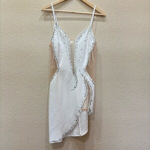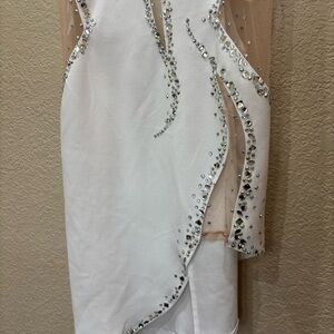Chic white dress with asymmetrical hem. Features sparkling details. Ideal for evening events.
