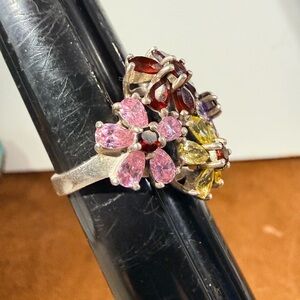 Elegant multicolor gemstone cluster ring featuring vibrant red, pink, purple, and yellow stones. 925, sterling silver, feminine & hard to find size 11.