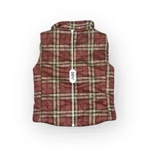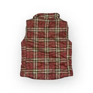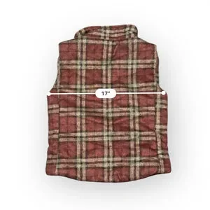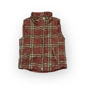 This is a pre-owned women's plaid vest from Vanilla Bay, size S. The vest features a red, beige, and black plaid pattern with a stand-up collar and a full snap-button front closure. It has two front pockets with flaps. The back of the vest measures approximately 17 inches across the chest and 20.5 inches in length. The interior appears to be lined with a solid red fabric.