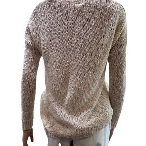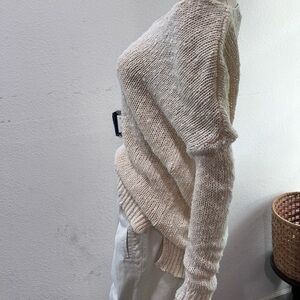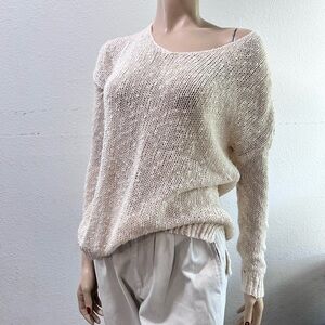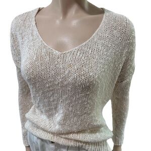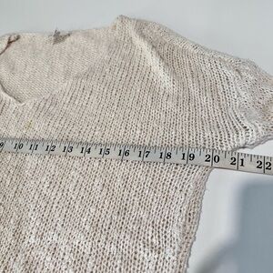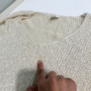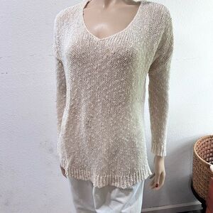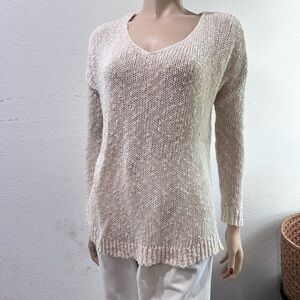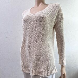 Embrace elegance with the Full Tilt Cream V-Neck Sweater, featuring a delicate loose-knit design and a soft, airy texture. This lightweight sweater is perfect for layering, offering a relaxed fit and a subtle textured pattern for a casual yet sophisticated look. The Essentials knit sweater in cream, size M, is a versatile and stylish addition to any woman's wardrobe. Made of a comfortable blend of cotton and acrylic, this pullover sweater features a flattering V-neckline and a classic knit fabric. The ivory color adds a touch of elegance, making it perfect for both casual and more formal occasions. With its regular size fit, this sweater from Essentials is a timeless choice for any fashion lover.