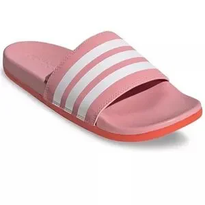 Comfortable Adidas slides with pink and white stripes. Ideal for everyday use.