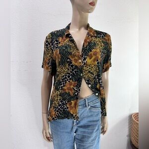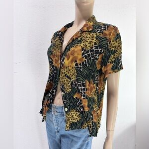 This stylish blouse from Requirements features a trendy animal print pattern in a vibrant multi-color design. The button-down neckline and short sleeves add a touch of sophistication to the top, making it perfect for a day out with friends or a casual office day. Made from lightweight and comfortable rayon material, this blouse is available in a women's size M (8-10) and is suitable for regular size types. The blouse is designed with an animal theme and is manufactured in Cambodia.