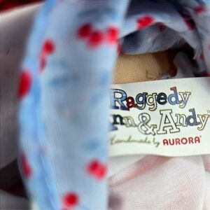 Raggedy Ann wears a lovely blue calico dress and white apron with red trim.