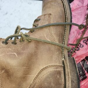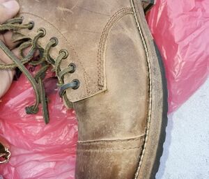 these are nice they got dinged hand crafted boots size 9 see pix iron rangers Thursday boots cap toe boots these are hand crafted id keep but not my size came from storage unit take to cobbler they can patch id leave them like that Distressed look