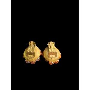 Beautiful vintage jewelry set featuring a long amber brown glass bead necklace paired with matching clip on earrings marked Germany. Necklace features carved oval glass beads with small spacer beads and a warm translucent glow. Earrings feature clustered amber and honey gold faceted beads with classic German clip on backs. Excellent mid century statement set.
