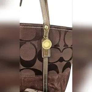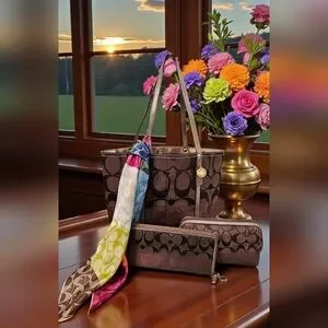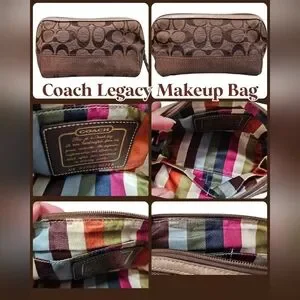 Coach Chocolate/bronze Jacquard Legacy set is made up with the beautiful Tote, in EUC. She has her bronze hangtag and gold medallion. Straps could use a little edgecoating, but are good as they are. She has a beautiful dark brown satin lining and measures 10" x 10" x 4". Legacy wallet is also in EUC. She is beautiful inside and out and has her gold medallion. She measures 8" x 4". Legacy make up case has some light staining from the glue at the top around the seams as shown in the photos. Her exterior is good. She measures 7" x 4 " x 3". Legacy Signature scarf is in EUC and is a rare one! These items have been thoughtfully put together to give you a gorgeous bundle! I will not separate.