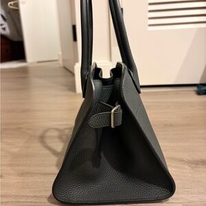 Softly structured petite top-handle bag in matte grained calfskin leather with belted side gussets, protective metal feet, removable shoulder strap, and interior toggle closure
