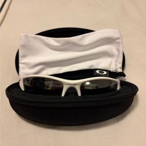 Sleek Oakley sunglasses featuring a white frame and dark gray lenses. Excellent used condition with hard case and soft sleeve/cleaning cloth!