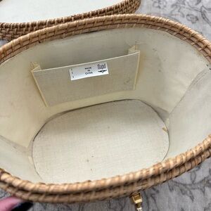 Structured woven wicker handbag with brown leather top handle and tab closure, gold-tone hardware, and lined interior ( with some minor imperfections ) please see pictures.