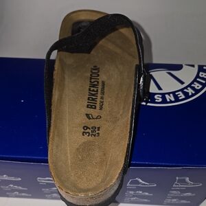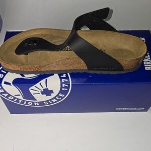 Classic Birkenstock sandals in black. Features a comfortable tan footbed. Ideal for casual outings.